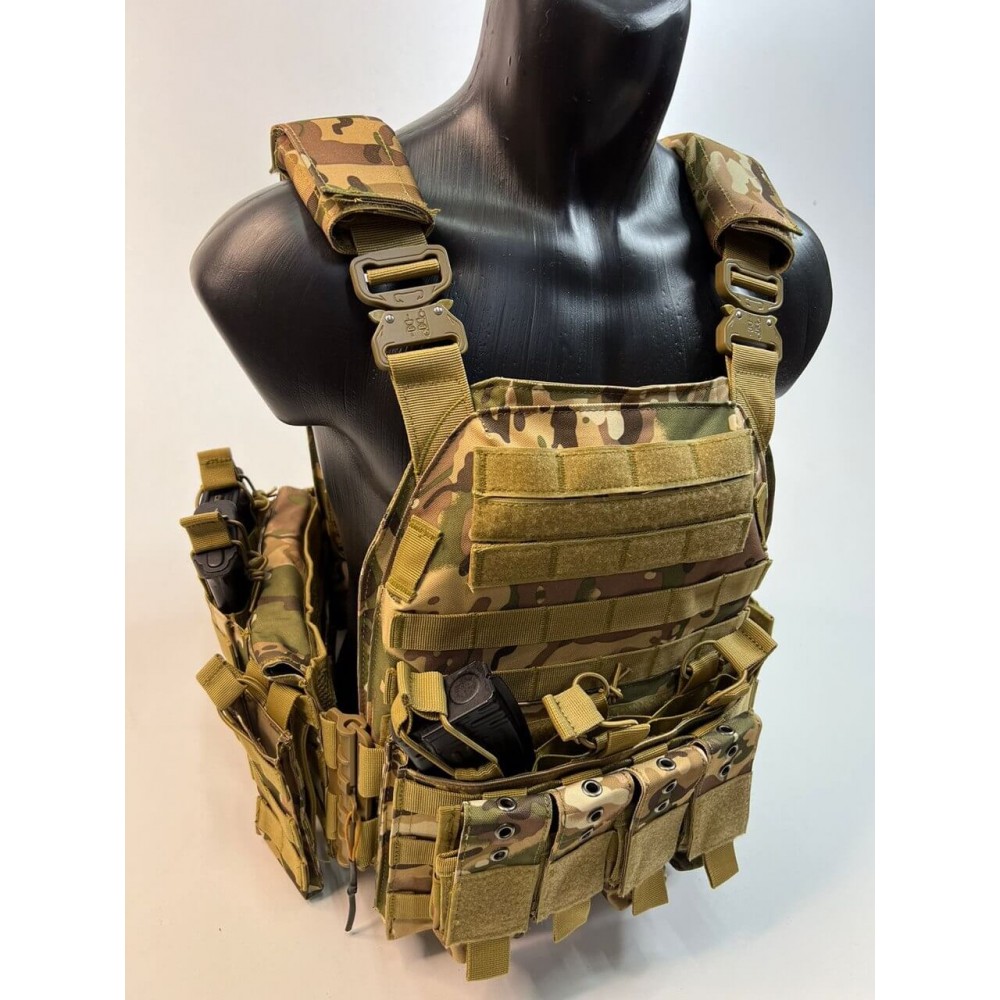 - Множество карманов: Жилет оборудован разнообразными карманами и системами крепления Molle, которые позволяют носить с собой различное тактическое снаряжение, включая магазины, гранаты, фонари, аптечку и другие необходимые предметы.